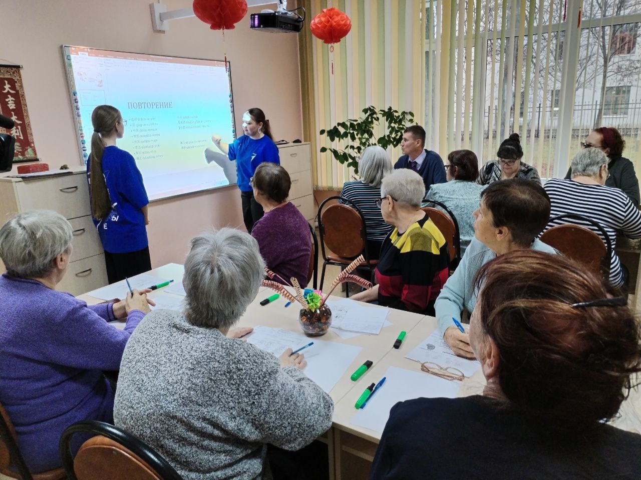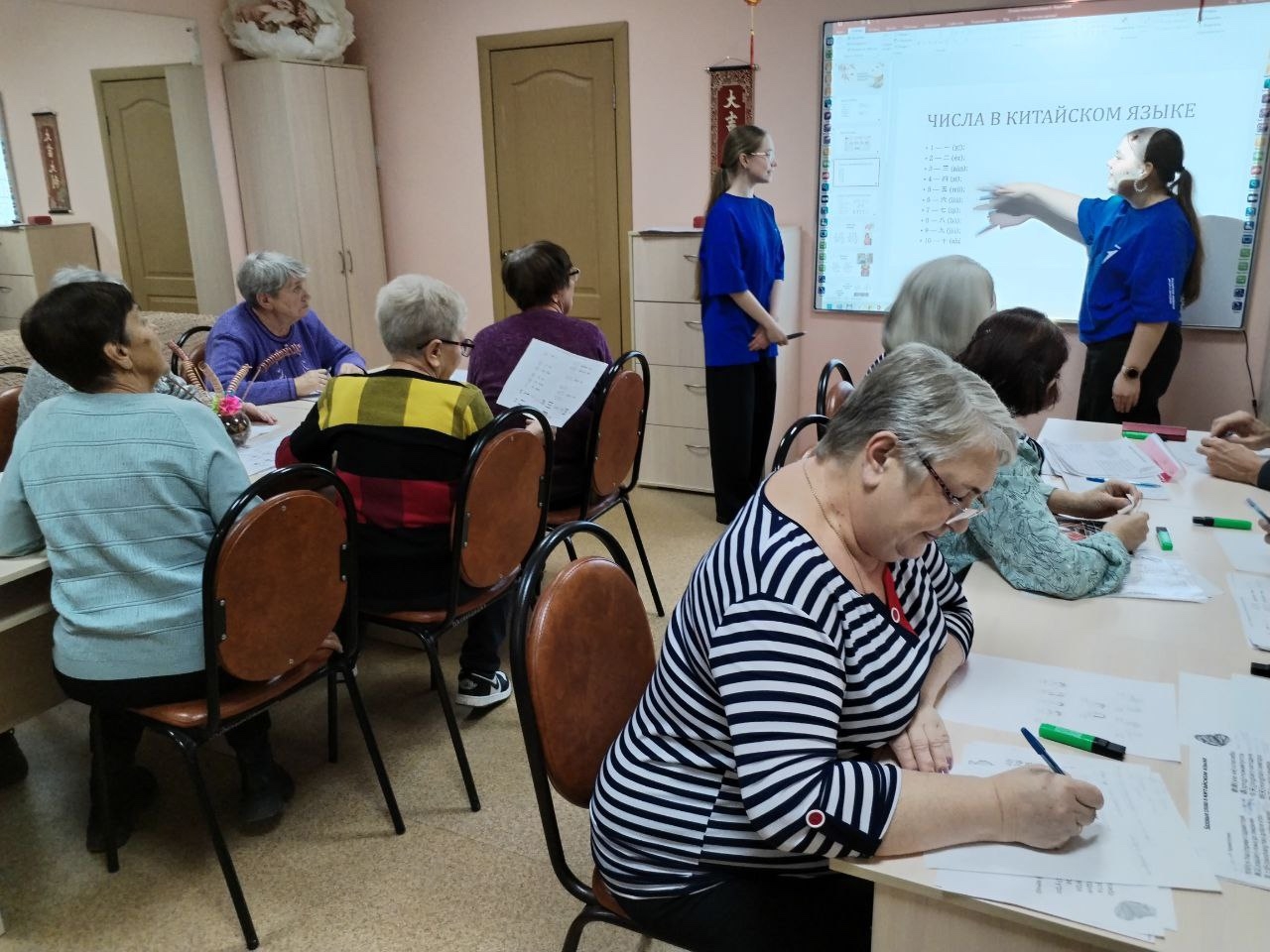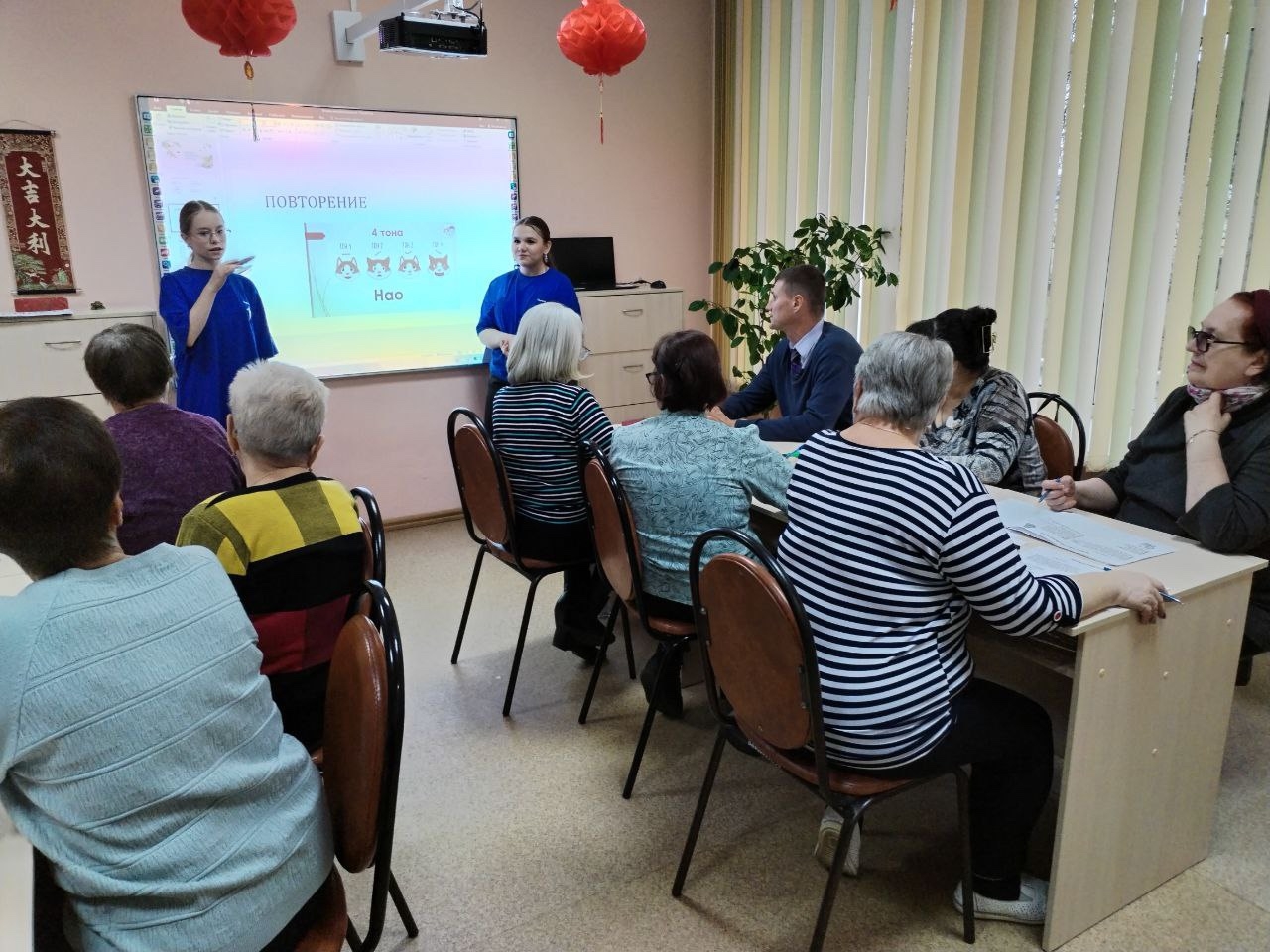 В МБУ «Центр социальной помощи семье и детям» Октябрьского района города Пензы для граждан пожилого возраста учащиеся 8А класса под руководством советника Шаморкиной С.М. провели очередное занятие по обучению китайскому языку. Это занятие было ориентировано на практическое применение знаний. Участники повторяли изученные слова, делали зарядку под счет на китайском языке, учились знакомиться и рассказывать немного о себе в диалоге.