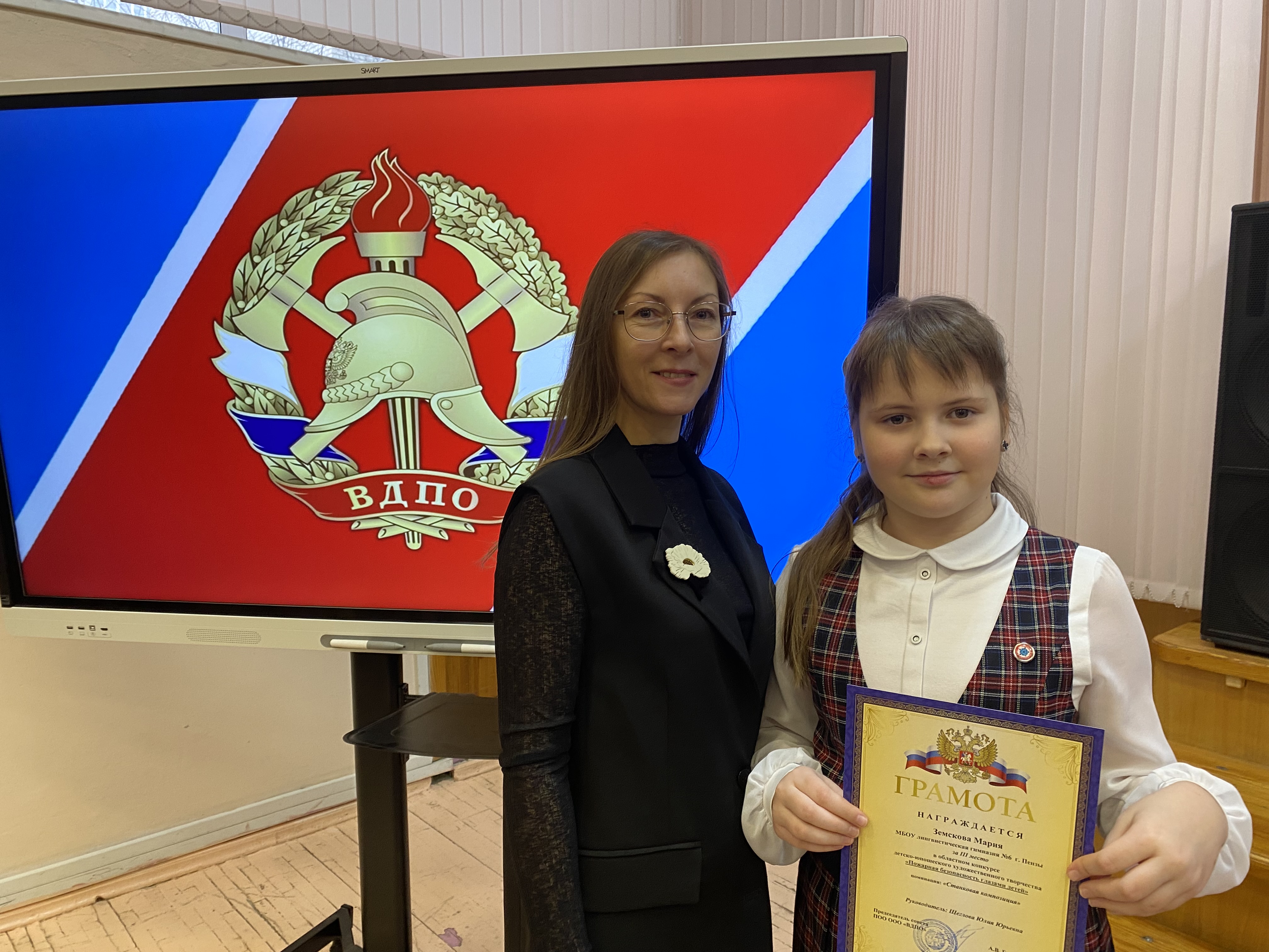 Призером конкурса стала ученица 4Б класса Мария Земскова. Мария подошла к участию в конкурсе максимально ответственно. Изучив историю пожарной охраны Пензенской области, она представила работу «Пензенский брандмейстер 1804г».